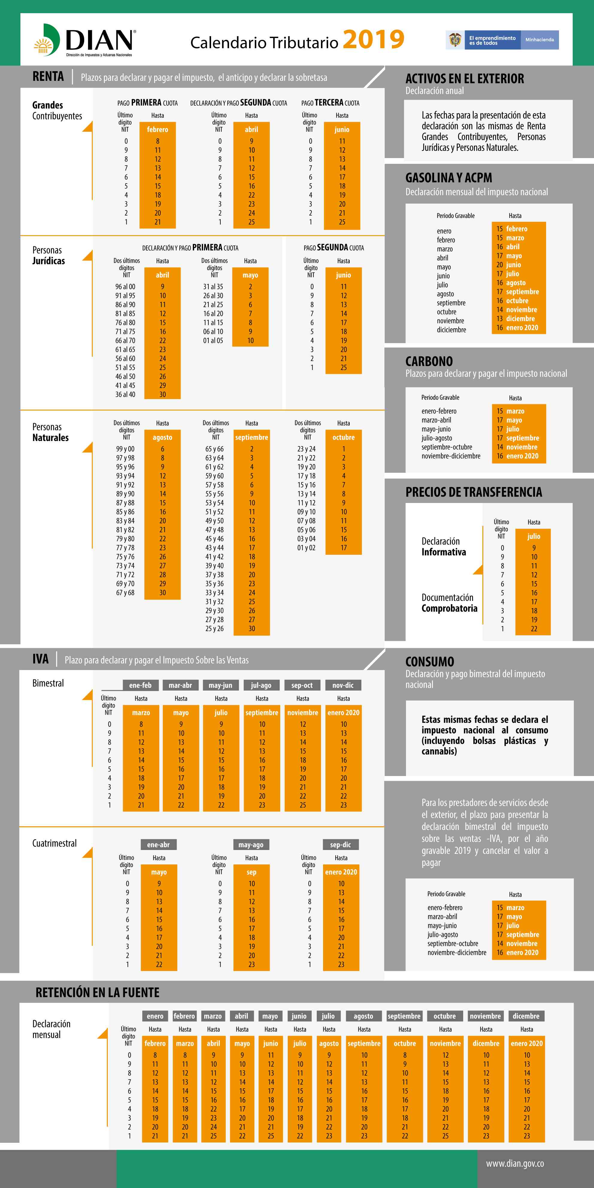 Cada año, el Gobierno publica un calendario de impuestos para que todas las personas cumplan a tiempo con sus obligaciones tributarias. Además, en este 2019 también será muy importante que los contribuyentes conozcan al detalle los cambios que se establecieron en la Ley de Financiamiento y que podrían afectarles el bolsillo.