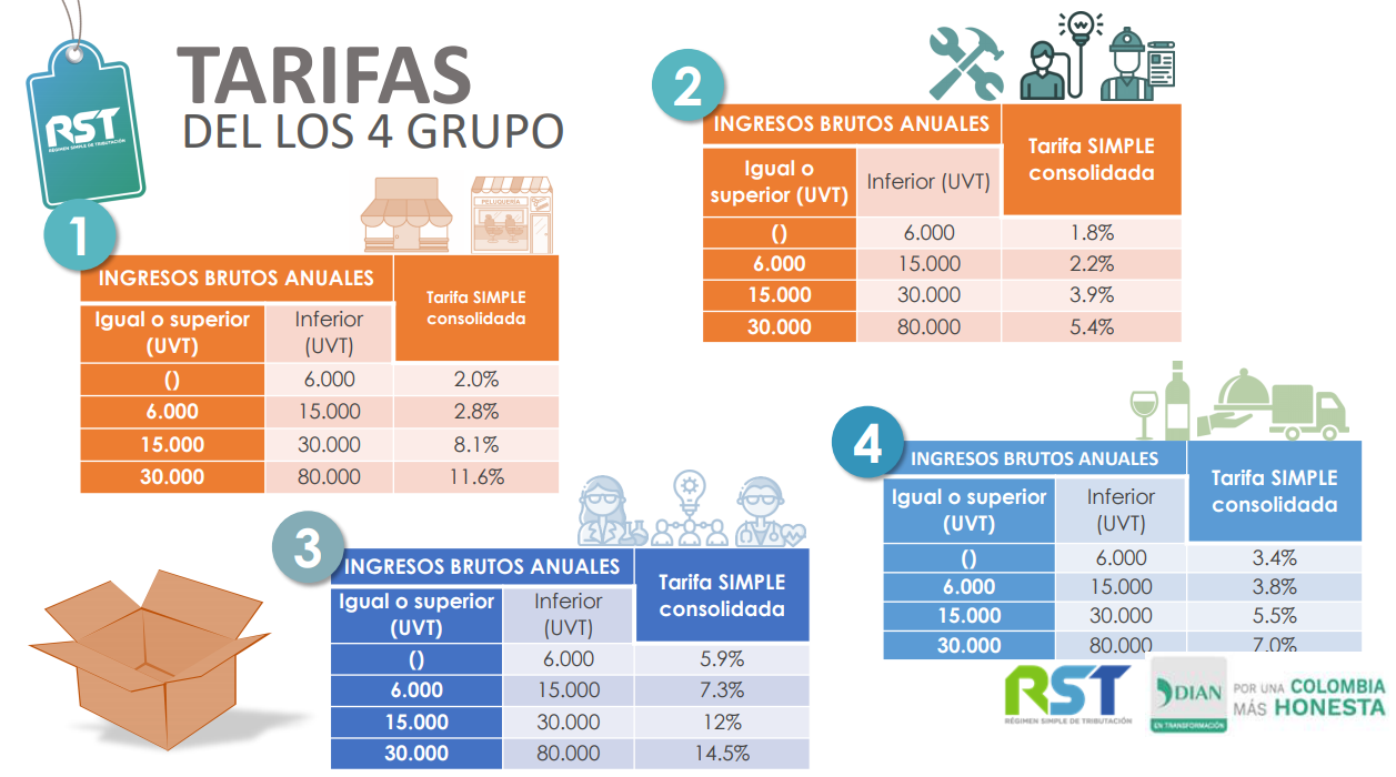 Las tarifas del #RST #RégimenSimpledeTributación dependen del grupo según la actividad económica así: