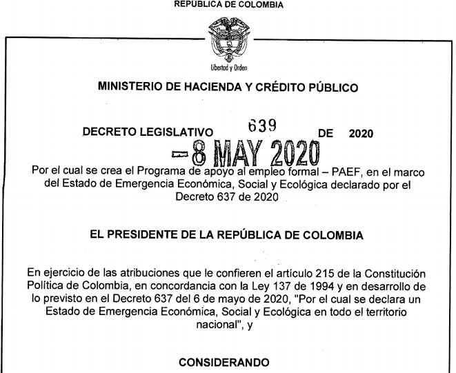 Descargr: Decreto 639 del 8 de mayo de 2020 | PAEF Programa de apoyo al empleo formal