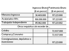 Obsérvese que aunque la norma nos hace diferenciar al universo de las personas naturales en tres distintas subcategorías (es decir, entre “asalariados”, “trabajadoresindependientes” y “las demás personas naturales”), en todas esas subcategorías los valores de la tabla anterior se comportan exactamente igual, a excepción del valor del requisito numero 2 (ingresos brutos).