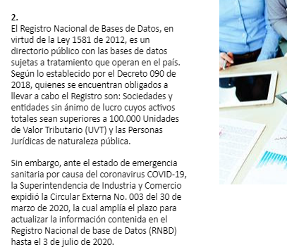 Sin embargo, ante el estado de emergencia sanitaria por causa del coronavirus COVID-19, la Superintendencia de Industria y Comercio expidió la Circular Externa No. 003 del 30 de marzo de 2020, la cual amplía el plazo para actualizar la información contenida en el Registro Nacional de base de Datos (RNBD) hasta el 3 de julio de 2020.