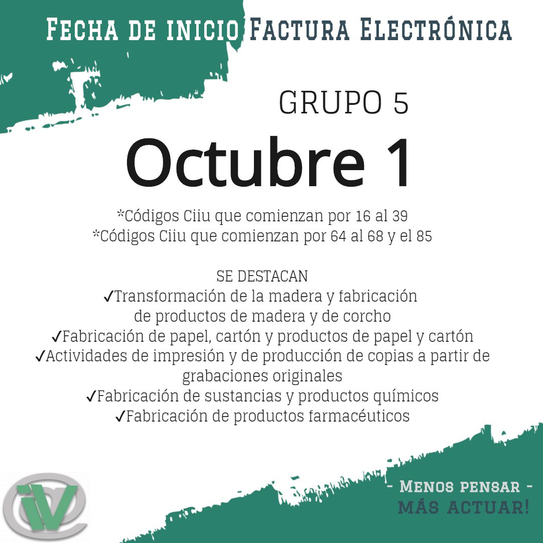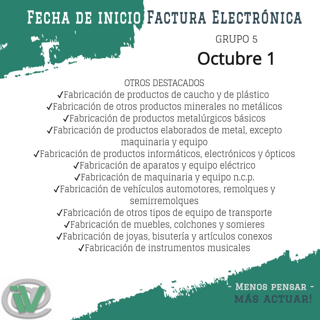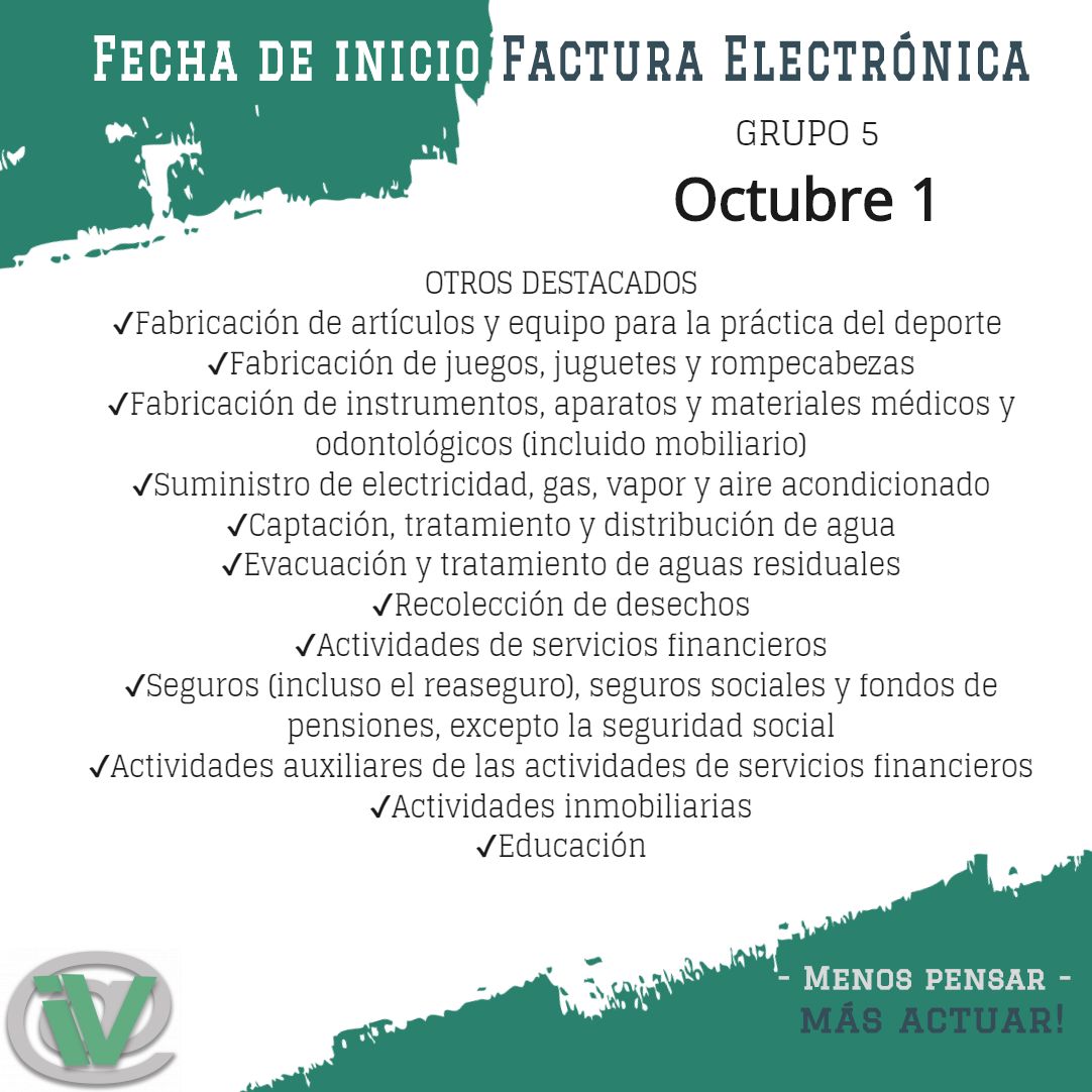 ✔️Para el Grupo 5 la fecha máxima para comenzar a facturar electrónicamente es 1 de octubre👌